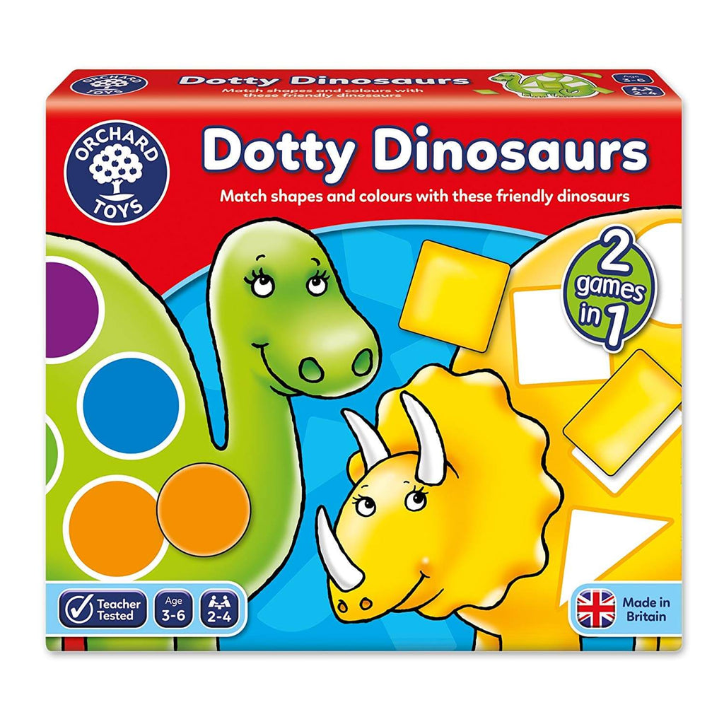 Dotty Dinosaurs Orchard Toys is a fantastic resource for Irish primary and secondary school classrooms. Designed to engage students while supporting key curriculum goals, it's perfect for teachers looking to add hands-on, engaging learning tools to their class. Help the dinosaurs to find their missing spots! This fun game features double-sided dinosaur boards with two games in one - on one side a shape board and on the other a colour board. Throw either the shape or colour dice and be the first to cover your dinosaur board with the correct pieces. Dotty Dinosaurs features beautiful hand drawn illustrations of different types of dinosaur, which parents can use to discuss with children. They can also discuss the different types of shapes they can see in the game, from simple shapes like circles and squares to the more complex semicircles and diamonds. Contents: 4 dinosaur boards 24 shapes 24 colour dots 1 shape dice 1 colour dice 1 dice shaker 1 instruction leaflet Not suitable for children under 3 years due to small parts. Choking hazard. This product is ideal for group activities, early finishers, or as part of your classroom resources cupboard. Trusted by educators across Ireland.