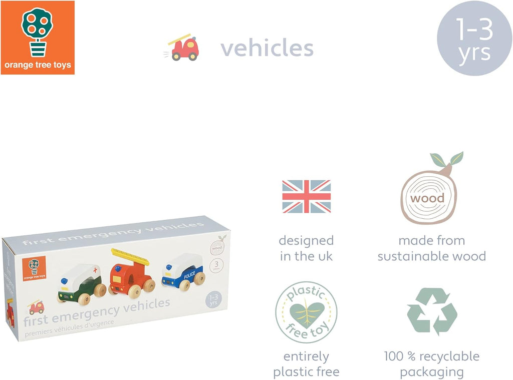 First Emergency Wooden Vehicles is a fantastic resource for Irish primary and secondary school classrooms. Designed to engage students while supporting key curriculum goals, it's perfect for teachers looking to add hands-on, engaging learning tools to their class. DEVELOP KEY MOTOR SKILLS: A beautiful set of brightly coloured traditional wooden Emergency Vehicles; an Ambulance, a Fire Engine and a Police Car, perfect for little hands to grasp and hold! SAFE FOR PLAY: Beautifully brightly painted with non toxic paint. All Orange Tree toys are tested both in-house during production and independently to meet European safety standards. Suitable from age 12 months PROMOTES DEVELOPMENT: Make learning fun; educational toys help to develop your child's imagination and key motor skills for movement, hand-eye co-ordination and dexterity. Traditional kids' play vehicles provide hours of fun! TRUSTED MANAFACTURER: Designed in the UK by Orange Tree Toys, in their headquarters in the Cotswold countryside. Orange Tree toys are environmentally friendly; made from FSC certified sustainable wood and 100% recyclable packaging. Wooden toys are durable and long lasting; they can be passed down the generations! PERFECT GIFT: Wooden cars for 1 year old and Toddlers are ideal 1st birthday gifts for girls and boys Christmas presents, Christening gifts or for another special occasion. They also encourage wonderful imaginative small world play for preschool or infant school children This product is ideal for group activities, early finishers, or as part of your classroom resources cupboard. Trusted by educators across Ireland.