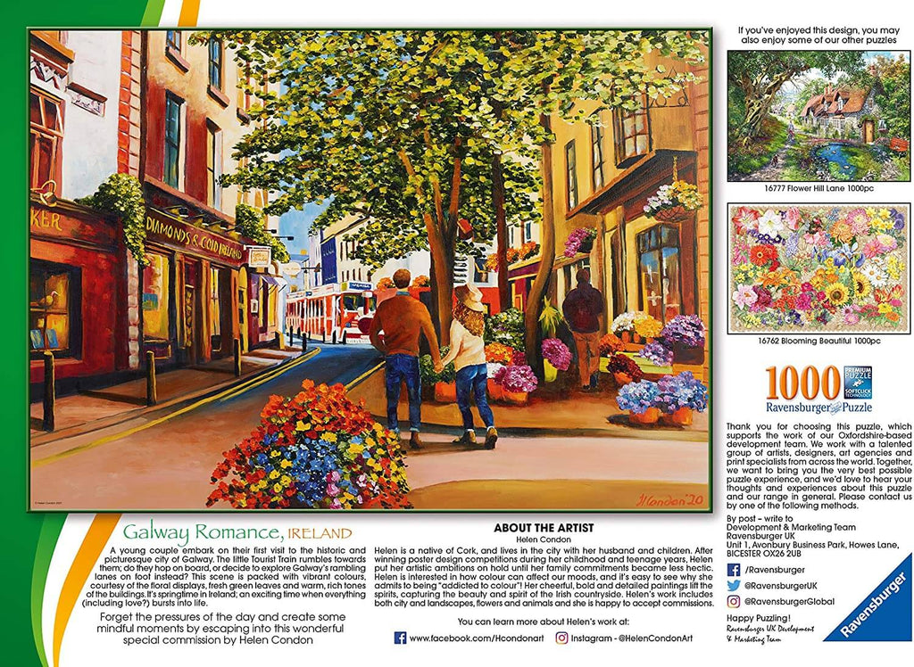 Galway Romance 1000 Piece Jigsaw Puzzle from Ravensburger is a fantastic resource for Irish primary and secondary school classrooms. Designed to engage students while supporting key curriculum goals, it's perfect for teachers looking to add hands-on, engaging learning tools to their class. Galway Romance 1000 Piece Jigsaw Puzzle from Ravensburger is the 2nd installment of the Ravensburger Irish Collection. T his very popular jigsaw shows a young couple discovering the magic of Galway! Bestselling puzzle brand worldwide - With over 1 billion puzzles sold, our jigsaw puzzles make ideal gifts for women, great gifts for men and fit perfectly on our puzzle board Our 1000 piece jigsaws are crafted with premium quality and measure 70 x 50cm when complete. Great for Adults and ideal puzzles for Children 12 years old and up. Our puzzles use an exclusive, extra-thick cardboard combined with our fine, linen structured paper to create a glare-free puzzle image and give you the best experience possible. Positively Puzzling - From fun family times together to long term health benefits and day-to-day mindful moments, there are so many positives about the humble Jigsaw! They make a great birthday gift or smashing Christmas gift Contents Puzzle 1000 pieces This product is ideal for group activities, early finishers, or as part of your classroom resources cupboard. Trusted by educators across Ireland.