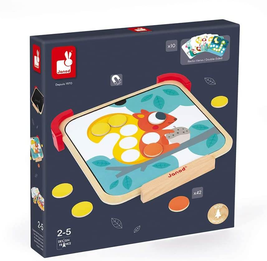 Endless colours! This educational magnetic game contains all the activities needed to learn colours from 2 years old. It consists of 10 double-sided cards, each containing an activity (picture to complete, tic-tac-toe...). The child must then place the card on the slate and reposition the magnetic dots (among the 42 included) in the right place in order to complete the picture and obtain a finished drawing. They can also use the slate and chalk provided with the game to stimulate their creativity. The large dots are suitable for small children's hands! This game will keep your children busy on the long holiday journey, for example.
