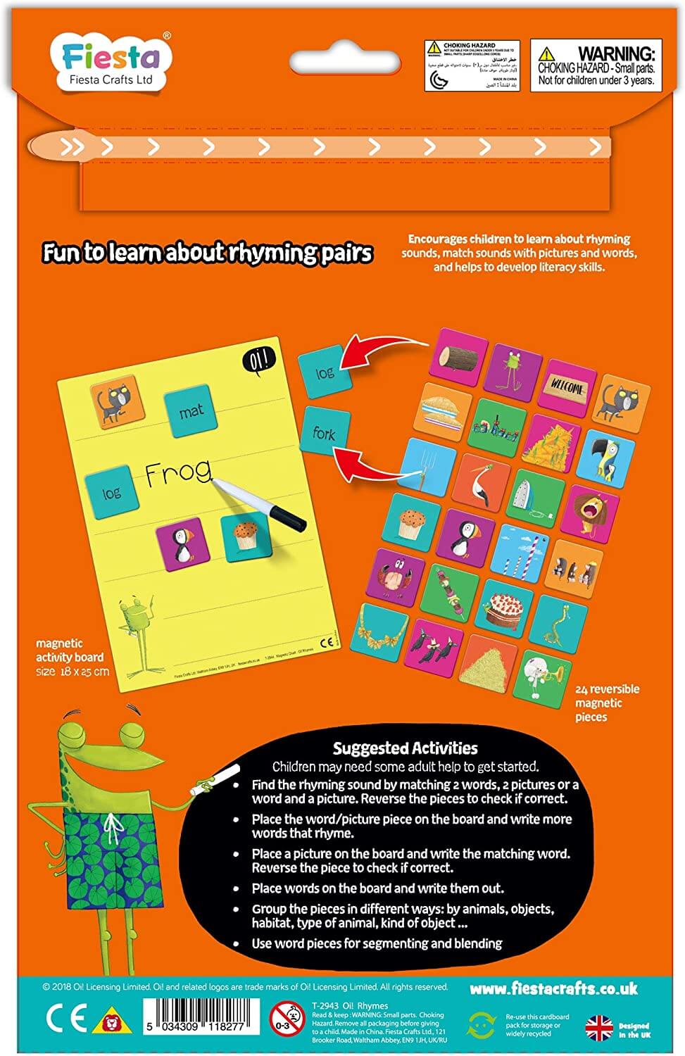 Magnetic Oi! Rhymes is a fantastic resource for Irish primary and secondary school classrooms. Designed to engage students while supporting key curriculum goals, it's perfect for teachers looking to add hands-on, engaging learning tools to their class. The Fiesta Crafts Oi Rhymes is an exciting activity toy based on Oi!s top selling and award-winning range of children's books! Oi! Magnetic Rhymes helps children to learn about rhyming sounds as they match sounds with pictures and words. Using the 25 reversible magnetic pieces, children will develop their literacy skills as they complete the activities suggested on the back of the pack. Oi Frog, Oi Dog and more have been hugely popular with children and teachers as the books, a publishing sales phenomenon aimed at ages 3-5, combine hilarious rhymes and gorgeous pictures. Oi! Magnetic Rhymes is suitable for ages 3-6 and contains a board and pen as well as the magnetic pieces. This product is ideal for group activities, early finishers, or as part of your classroom resources cupboard. Trusted by educators across Ireland.