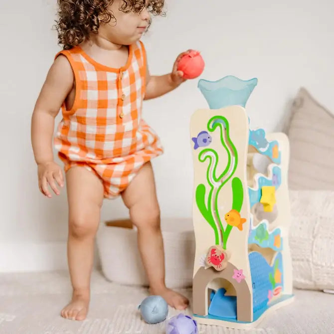 Get playtime and developmental skills rolling with Rollables--adorably round characters that are firm enough to roll but soft enough to squeeze! Inspire imaginative oceanside adventures through kinetic play with this sturdy wooden ramp tower and three Rollables: the friendly crab, silly shark, and awesome octopus with chime. Compatible with other Rollables play sets. Drop Rollables into the removable funnel, and watch them tumble down the wavy slide and out the whale's mouth. Turn the sea star and press the whale's flipper to stop and start the action. A built-in bead maze adds to the excitement and tactile experience for kids. The Rollables Ocean Slide is an engaging way to introduce infants and toddlers 12 months and older to cause and effect while encouraging development of important sensory, fine motor, and problem-solving skills. Melissa & Doug infant and toddler toys inspire "a-ha!" moments of discovery. Adorable, diverse characters and a variety of fun shapes and textures encourage exploratory, skill-building play. As part of Melissa & Doug's commitment to helping protect and preserve our planet's natural resources for our children's future