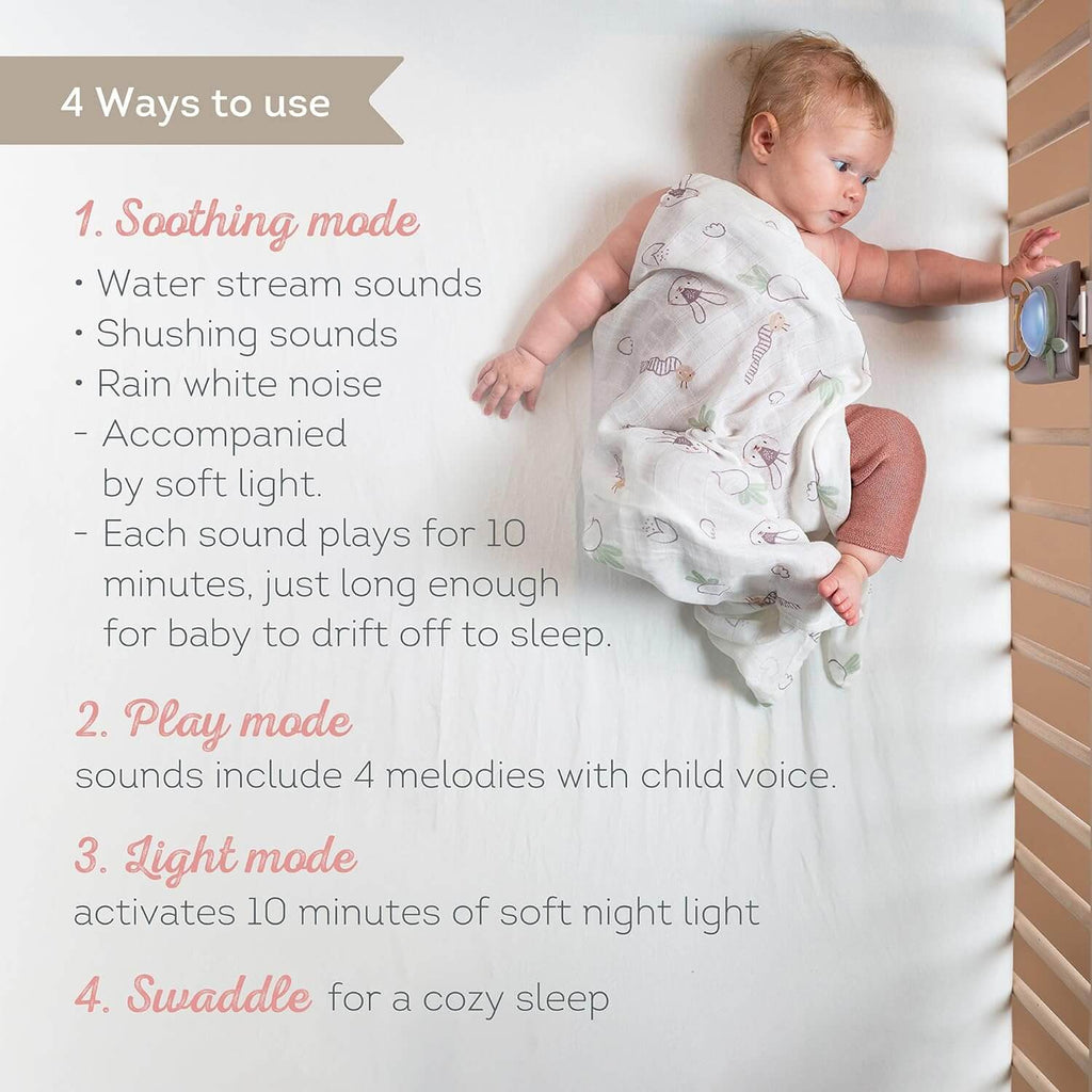 Baby Soothing Sound Machine with Cry Activated Sensor Bunny Soother and Swaddle Set is a fantastic resource for Irish primary and secondary school classrooms. Designed to engage students while supporting key curriculum goals, it's perfect for teachers looking to add hands-on, engaging learning tools to their class. I Cry-Activated Sensor - This baby soothing sounds machine is equipped with a cry-activated sensor that reactivates music and light when your baby cries or makes noise, providing immediate comfort and helping them drift back to sleep. With standby mode starting after 30 minutes of soothing sounds. Soothing melodies such as water stream, shooting, and rain white noises, accompanied by a soft light, each playing for 10 minutes to help your baby peacefully drift off to sleep. Perfect Newborn Collection - Our Soothing Bunny Set, consists of a cry activated sensor unit and a premium quality baby swaddle crafted from a luxurious blend of 70% bamboo and 30% cotton, offers a comforting and calming experience for your baby, especially at bedtime. It crafts with the utmost care, our baby swaddle is gentle on your baby's delicate skin, providing a cozy and snug, keeping your baby comfortable and cozy all night long. Soft Light Feature - Accompanying the soothing sounds is a soft light that can help soothe and calm your baby, promoting relaxation and better sleep quality. ENHANCES SENSORY DEVELOPMENT - The Soothing Bunny Set offers a range of soothing melodies such as water stream, shushing, and rain white noises, which can help stimulate your baby's senses and promote sensory development. The soft light that accompanies the melodies can also help soothe and calm your baby, promoting relaxation. Premium Quality Baby Swaddle - The set includes a luxurious baby swaddle made of 70% bamboo and 30% cotton, designed to provide a cozy and snug fit that makes your baby feel safe and secure. SOFT & COMFORTABLE our swaddle is gentle on your baby's delicate skin, providing a cozy and snug fit to help your little one sleep better without being overheating. Machine washable and fade resistant. Portable and Easy to Use - This baby calming device is perfect for travel or on-the-go. Its compact size makes it easy to carry around, ensuring your baby can have a peaceful sleep anywhere. It's also incredibly easy to use, just activate the cry sensor and let the machine do the rest, providing your baby with soothing sounds and light. Ideal for baby essentials and must-haves, this portable sound machine baby travel is a great addition to your baby gear. Baterries: 3 AA (not included) This product is ideal for group activities, early finishers, or as part of your classroom resources cupboard. Trusted by educators across Ireland.